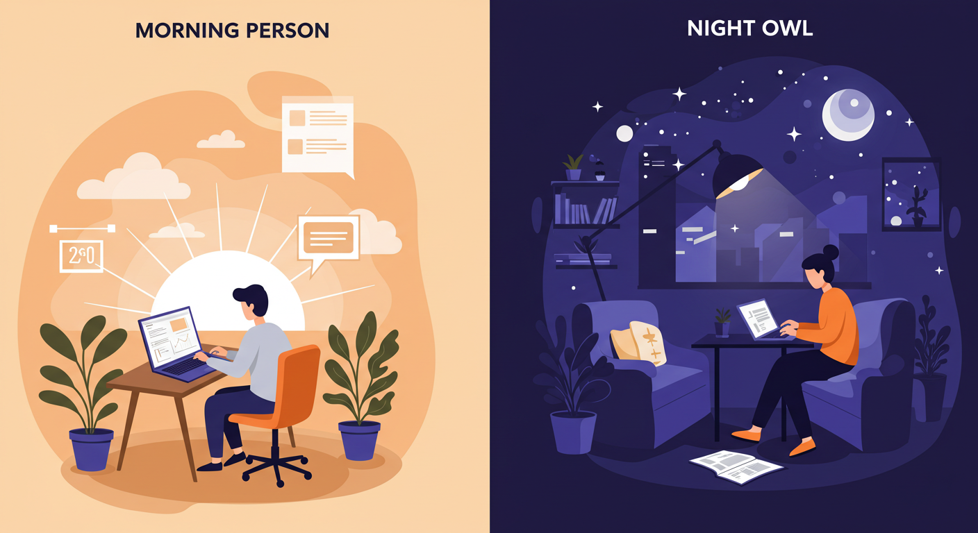 아침형 인간과 올빼미형 인간, 과연 언제 일하는 것이 더 효과적일까? 자신의 생체 리듬에 맞춰 최상의 생산성을 발휘하는 방법을 알아봅니다.